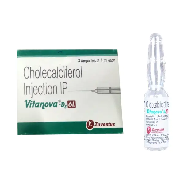 Generic Name : Cholecalciferol Injection IP (Vitamin D3) Active Ingredient (per 1 ml ampoule) : Cholecalciferol IP — 6,00,000 IU (equivalent to 15 mg) Dosage Form & Strength : Form: Injectable solution (clear oil/solution) Strength: 6,00,000 IU Vitamin D3 per 1 ml ampoule Route of Administration : Intramuscular (IM) injection only Therapeutic Class: : Vitamin D3 supplement / Nutrient / Vitamin Mechanism of Action: : Cholecalciferol (Vitamin D3) helps the body absorb calcium and phosphorus, essential for bone mineralization and maintenance Packaging: : Usually supplied in 1 ml ampoules VITANOVA D3 6L Injection – Uses : Active ingredient: Cholecalciferol (Vitamin D3) – 6,00,000 IU per 1 ml Class: Vitamin supplement / Nutrient Form: Injectable solution (IM injection) Treatment of Vitamin D Deficiency : Corrects severe vitamin D deficiency in adults and children. Useful when oral supplementation is inadequate or not possible Management of Osteomalacia & Rickets : Osteomalacia: Softening of bones in adults due to lack of vitamin D. Rickets: Weak or deformed bones in children caused by vitamin D deficiency Support for Bone Health : Helps increase calcium and phosphorus absorption, supporting: Bone mineralization Prevention of fractures Overall skeletal health Special Situations : In patients with malabsorption syndromes (e.g., celiac disease, post-bariatric surgery). When rapid correction of vitamin D levels is needed under medical supervision Vitanova D3 6L Injection (600,000 IU of Cholecalciferol) is a high-dose vitamin D3 supplement used to treat severe vitamin D deficiency, osteoporosis, rickets, and osteomalacia (soft bones). It helps increase calcium and phosphate absorption from the gut, strengthening bones, improving immunity, and supporting cardiovascular health. Key Uses and Therapeutic Benefits : Severe Vitamin D Deficiency: Corrects critical shortages, often caused by malabsorption diseases of the gut, liver, or gallbladder. Bone Health (Rickets & Osteomalacia): Treats weak, soft, or brittle bones in both children and adults by enabling proper bone mineralization. Osteoporosis: Prevents the loss of bone density and reduces fracture risk, especially in post-menopausal women. Hypocalcemia: Manages low calcium levels in the blood, often linked to hypoparathyroidism. Immune System Support: Boosts immunity and increases resistance against various infections. How It Worksm : Vitamin D3 is converted in the liver and kidneys to its active form, calcitriol, which helps the intestines absorb calcium and phosphate, improving bone strength.