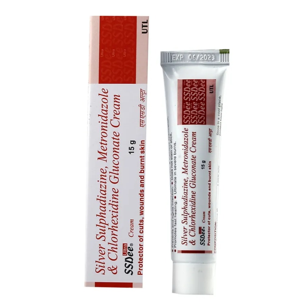 SSDEE Ultra Cream (15g) is a prescription topical medication primarily used to prevent and treat bacterial infections in second and third-degree burns, as well as on other wounds. It contains a combination of antibiotics (Silver Sulfadiazine, Metronidazole) and an antiseptic (Chlorhexidine Gluconate) that kills microorganisms, reduces pain, and aids healing.