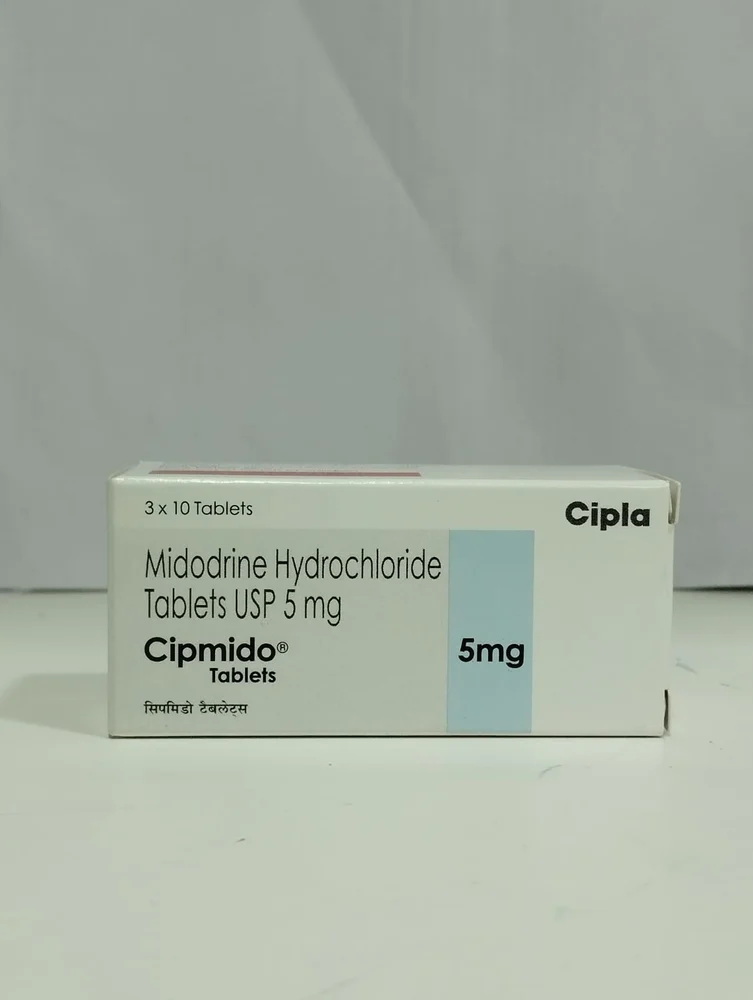 Active Ingredient : Midodrine Hydrochloride 5 mg per tablet — an alpha-1 adrenergic agonist that works by constricting blood vessels to help raise blood pressure. Form & Strength : Dosage Form: Oral tablet Strength: 5 mg midodrine per tablet Pack Size: 30 tablets in a strip/bottle format (1 × 30) Therapeutic Class : Antihypotensive agent (used to treat low blood pressure) Mechanism of Action : Activates alpha-1 receptors on blood vessel walls → causes tightening (vasoconstriction) → increases blood pressure. Treatment of Orthostatic Hypotension (Primary Use) : Used to treat symptomatic orthostatic hypotension, a condition where blood pressure drops when standing up. Helps reduce symptoms like: Dizziness Lightheadedness Fainting (syncope) Blurred vision Weakness when standing Midodrine works by tightening blood vessels, which raises blood pressure. Chronic Low Blood Pressure Used in patients with: Autonomic dysfunction Neurogenic hypotension Certain neurological disorders affecting blood pressure control Cipmido 5 mg Tablet (containing Midodrine) is primarily used to treat symptomatic orthostatic hypotension, a condition causing a sudden drop in blood pressure and dizziness when standing up. It works as an alpha-1 adrenergic agonist to constrict blood vessels, increasing blood pressure and improving blood circulation. Orthostatic Hypotension: Treats low blood pressure that causes dizziness, lightheadedness, or fainting when changing positions (e.g., rising from a sitting/lying position). Managing Fainting: Helps reduce episodes of fainting or dizziness due to low blood pressure. Improving Circulation: Increases blood flow to vital organs. Key Considerations : Dosage & Usage: Typically taken orally as directed by a doctor, usually during the daytime when standing/upright. It should be swallowed whole. How It Works : Stimulates alpha-1 receptors Causes vasoconstriction (narrowing of blood vessels) Increases standing blood pressure