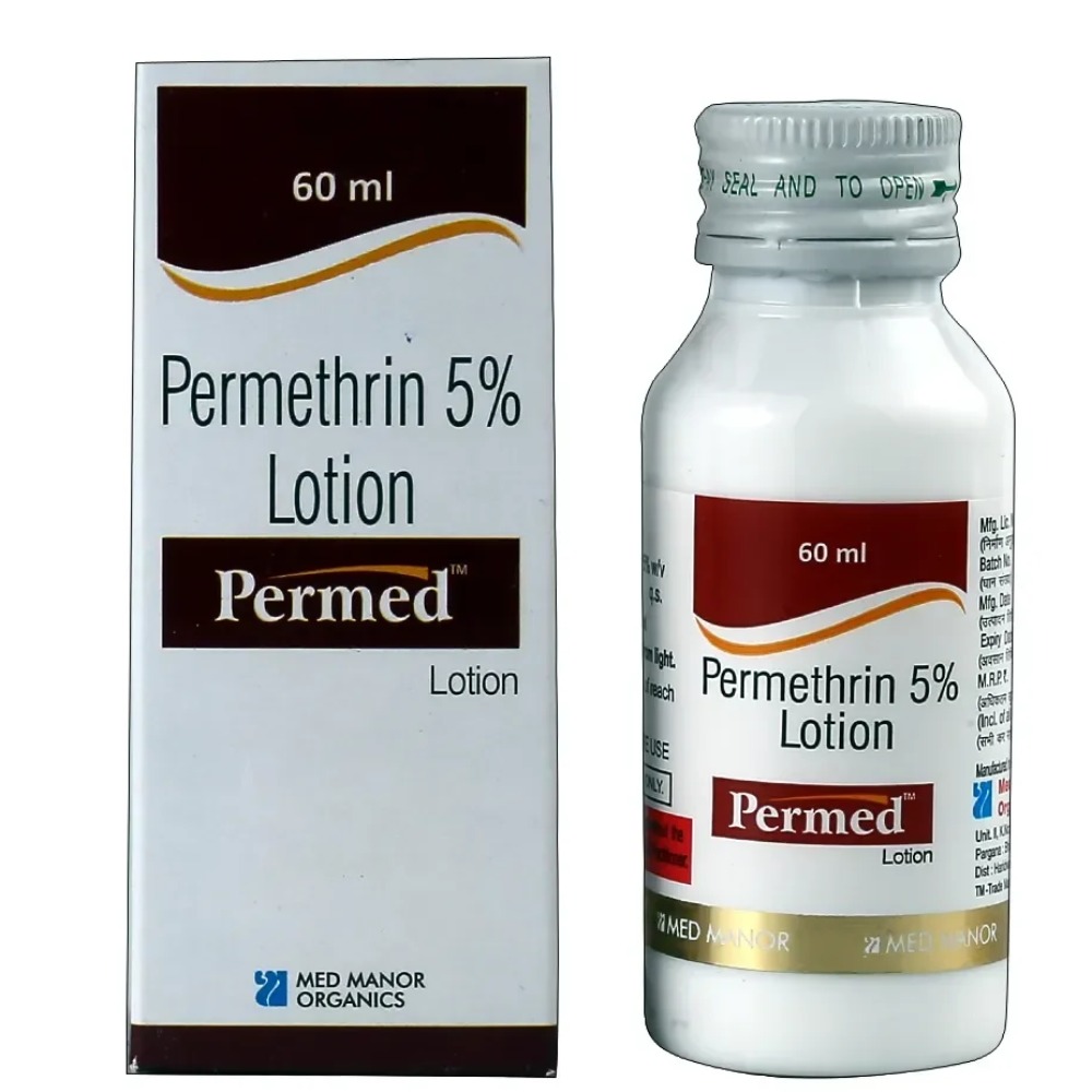 Permed Lotion 60 ml. PERMED LOTION is used to treat infections caused by eggs, lice, and mites. It is mainly used in the treatment of pediculosis and scabies. It contains Permethrin, which kills the small insects (mites) and their eggs that cause scabies.