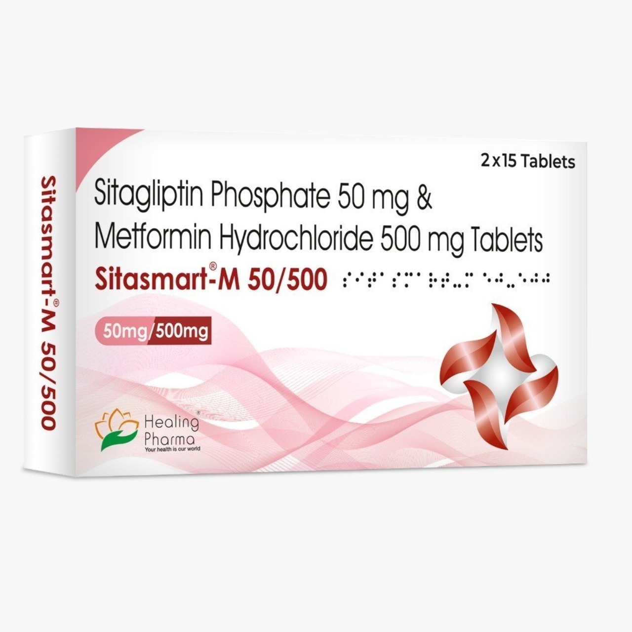 SITASMART M 50/500 MG tablet is a combination medication containing Sitagliptin (50 mg) and Metformin (500 mg) used to treat Type 2 diabetes mellitus in adults. It helps control high blood sugar levels—particularly after meals—by enhancing insulin sensitivity, reducing liver glucose production, and increasing insulin release. It should be used with diet and exercise.