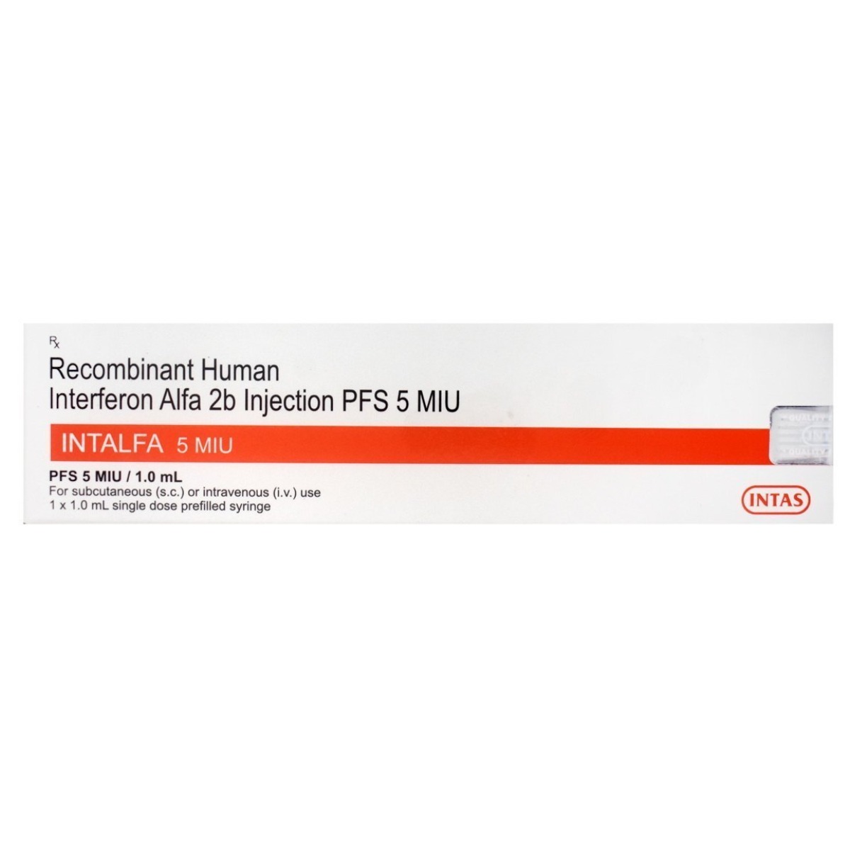 Intalfa 5Million IU Injection is used in the treatment of chronic hepatitis B virus (HBV) infection, chronic hepatitis C virus (HCV) infection, multiple myeloma, follicular lymphoma, and hairy cell leukemia.
