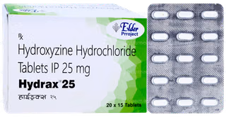 Generic name: Hydroxyzine Brand name: Hydrax Strength: 25 mg Dosage form: Tablet Drug class: Antihistamine (First-generation, sedating) Composition Hydroxyzine Hydrochloride IP – 25 mg Indications / Use Allergic conditions (itching, hives, rashes) Anxiety and tension Sedation (calming effect) Sometimes used for itching in skin diseases Route of administration Oral (by mouth) Dosage As prescribed by a doctor Dose varies based on age, condition, and response Main Uses of Hydrax 25 mg Allergy Relief (Antihistamine effect) Hydrax is used to treat allergic reactions such as: Itching Swelling Rashes Skin conditions like eczema, dermatitis and urticaria (hives) These symptoms occur due to histamine release; hydroxyzine blocks histamine to reduce these effects. Anxiety and Tension Hydrax can help reduce feelings of anxiety, restlessness, and tension, especially short-term anxiety related to stressful situations. Preoperative Sedation / Relaxation It is sometimes used before surgeries or medical procedures to promote calmness and mild sedation. Other Uses (less common / off-label) Some sources mention it may help with nausea/vomiting or act as a short-term sleep aid due to its sedative effects — but this should only be under doctor guidance.