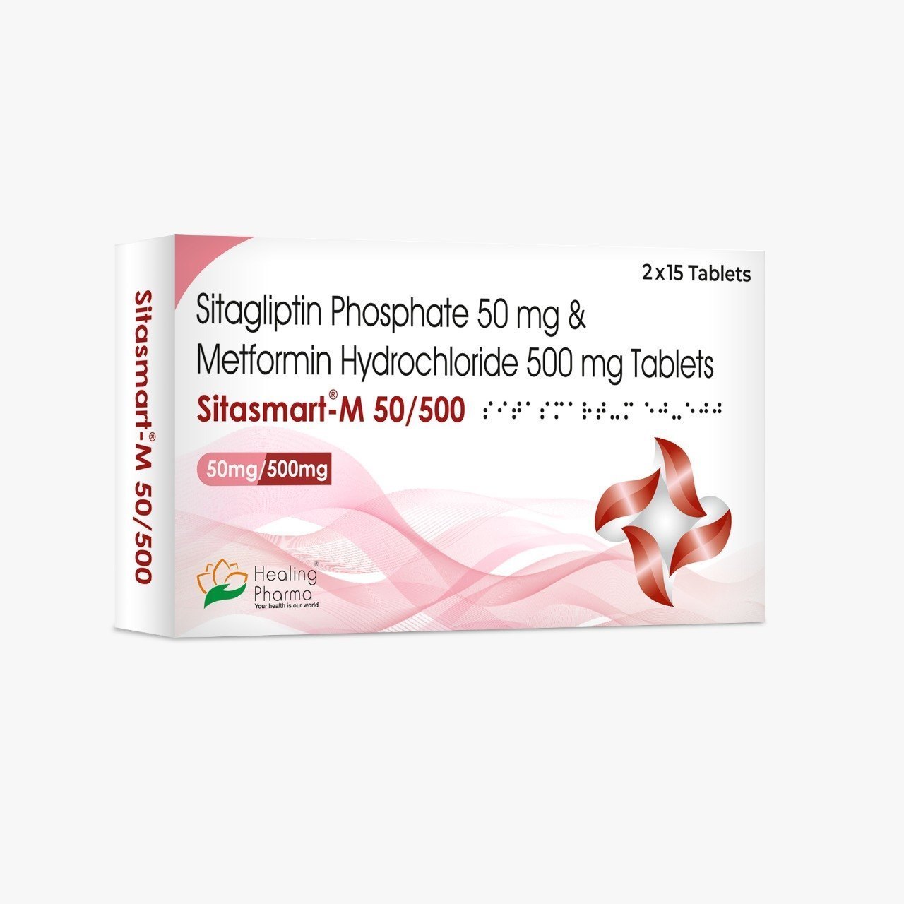 Medicine Name: Sitasmart-M 50/500 mg Tablet Form: Oral tablet Strength: Sitagliptin 50 mg + Metformin 500 mg per tablet Category: Antidiabetic (Type 2 diabetes control) Composition : Sitagliptin 50 mg – a DPP-4 inhibitor that helps increase insulin release after meals. Metformin 500 mg – a biguanide that reduces liver glucose production, delays intestinal glucose absorption, and improves insulin sensitivity. Therapeutic Class : Antidiabetic combination medicine – used to control high blood sugar levels in Type 2 diabetes mellitus. Key Properties : Route: Oral (swallowed whole with water) Administration: Usually taken with or after food to reduce stomach upset. Dosage: typically once or twice daily based on sugar levels and response. Storage: Store in a cool, dry place away from direct sunlight. Sitasmart-M is an oral antidiabetic medicine used to control Type 2 Diabetes Mellitus. 🩸 Main Use : Type 2 Diabetes – Helps lower and control high blood sugar levels. Key Uses and Benefits : Type 2 Diabetes Management: Controls blood sugar levels in adults. Improved Insulin Sensitivity: Helps the body use existing insulin more effectively. Decreased Liver Glucose Production: Lowers the amount of sugar produced by the liver. Prevents Complications: Helps prevent long-term diabetes complications like kidney damage, blindness, and heart disease. SITASMART M 50/500 MG tablet is a combination medication containing Sitagliptin (50 mg) and Metformin (500 mg) used to treat Type 2 diabetes mellitus in adults. It helps control high blood sugar levels—particularly after meals—by enhancing insulin sensitivity, reducing liver glucose production, and increasing insulin release. It should be used with diet and exercise. How it helps : It contains two medicines that work together: Metformin (500 mg) Decreases glucose production in the liver Improves insulin sensitivity Reduces sugar absorption from the intestine Sitagliptin (50 mg) Increases insulin release after meals Reduces excess glucagon (a hormone that raises blood sugar) Together, they help : Maintain stable blood sugar levels Reduce risk of diabetes-related complications (kidney damage, nerve damage, eye problems, heart disease)