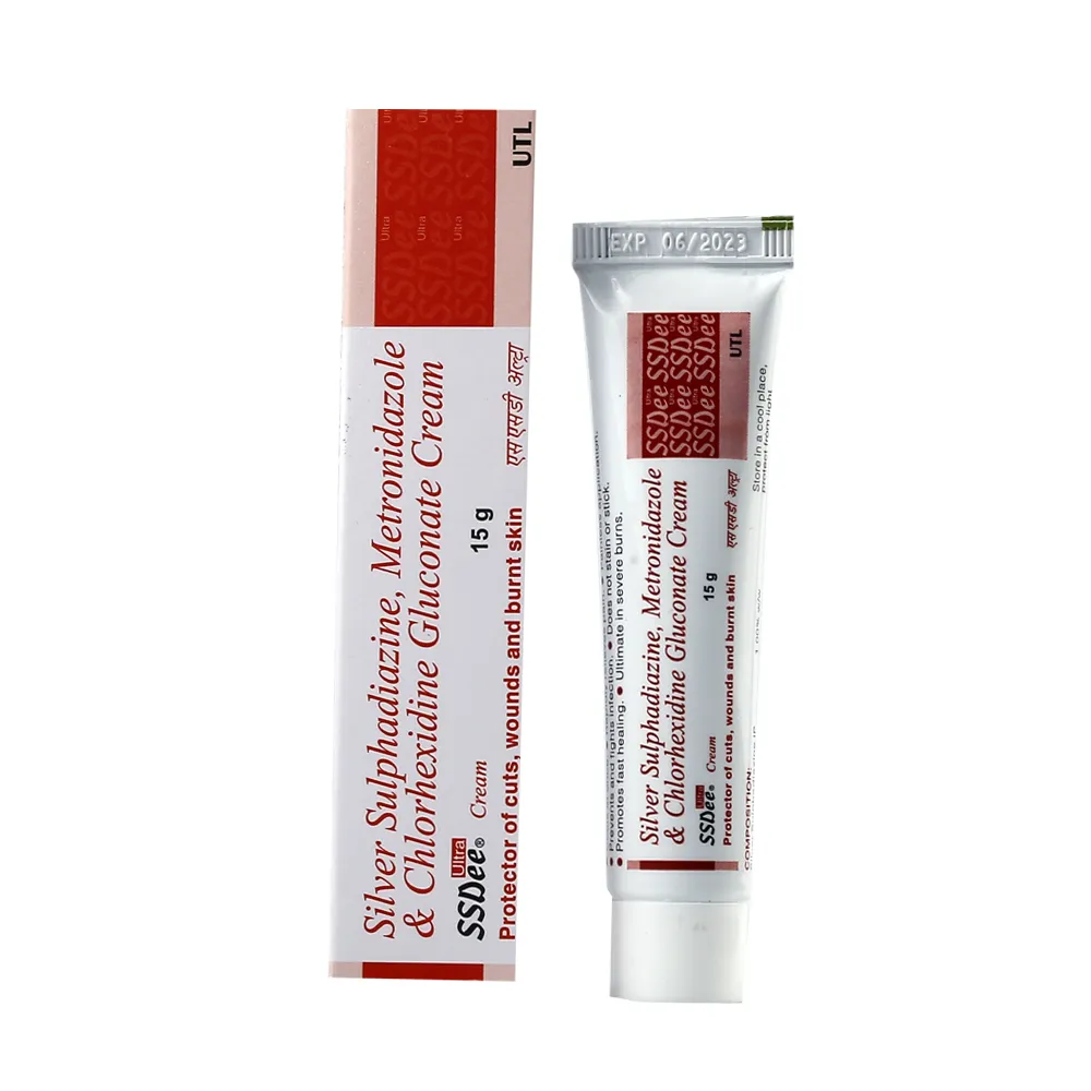 Product Name: Ssdee Ultra Cream 15 gm Form: Topical cream (for external use only) Pack Size: 15 gm tube Manufacturer/Marketer: Universal Twin Labs Pvt Ltd (India) Composition / Active Ingredients : Silver Sulfadiazine 1% w/w – antibiotic agent that helps prevent and treat bacterial infection in burns/wounds. Metronidazole 1% w/w – antibiotic effective against anaerobic bacteria and some parasites. Chlorhexidine Gluconate 0.20% w/w – antiseptic that kills or inhibits growth of microorganisms on skin. SSDEE Ultra Cream is a topical antimicrobial cream, primarily used to prevent and treat skin infections. Burns: Prevents bacterial infection in first- and second-degree burns. Wounds and cuts: Helps reduce risk of infection in open skin wounds. Skin infections: Treats minor bacterial or anaerobic skin infections. Post-surgical sites or abrasions: Keeps the area clean and promotes safer healing It works by combining antibiotic and antiseptic agents to kill or inhibit the growth of bacteria, creating a cleaner environment for the skin to heal. Purpose / Drug Class : Therapeutic Class: Topical antimicrobial/antiseptic cream. Action: • Silver sulfadiazine and metronidazole help kill bacteria that can infect injured skin. • Chlorhexidine gluconate helps clean and disinfect the area to prevent re-infection. Uses : Primarily used for prevention and treatment of infection in burns and open skin wounds. Helps reduce risk of infection, irritation, and discomfort at the affected site. Promotes cleaner wound environment to support healing. Application : External use only. Wash and dry the affected area before applying a thin layer as directed by a doctor. Typically applied 1–2 times a day or as advised. Wash hands after use (unless hands are being treated) Burn Treatment: Prevents and treats infections in patients with burns, reducing pain, irritation, and inflammation. Infected Wounds: Used to treat infections in open wounds, ulcers, or skin infections. Post-Operative Care: Applied to skin to prevent infection in surgical wounds. SSDEE Ultra Cream (15g) is a prescription topical medication primarily used to prevent and treat bacterial infections in second and third-degree burns, as well as on other wounds. It contains a combination of antibiotics (Silver Sulfadiazine, Metronidazole) and an antiseptic (Chlorhexidine Gluconate) that kills microorganisms, reduces pain, and aids healing. How to Use : External Use Only: Apply to the affected area, usually one or two times a day, or as directed by a doctor. Application: Clean and dry the wound area first, then apply a thin layer using sterile gloves or a spatula. How It Works : The combination of antibiotic and antiseptic agents kills or inhibits growth of microbes (bacteria and some anaerobic organisms), reducing the chance of infection in burns or injured skin.