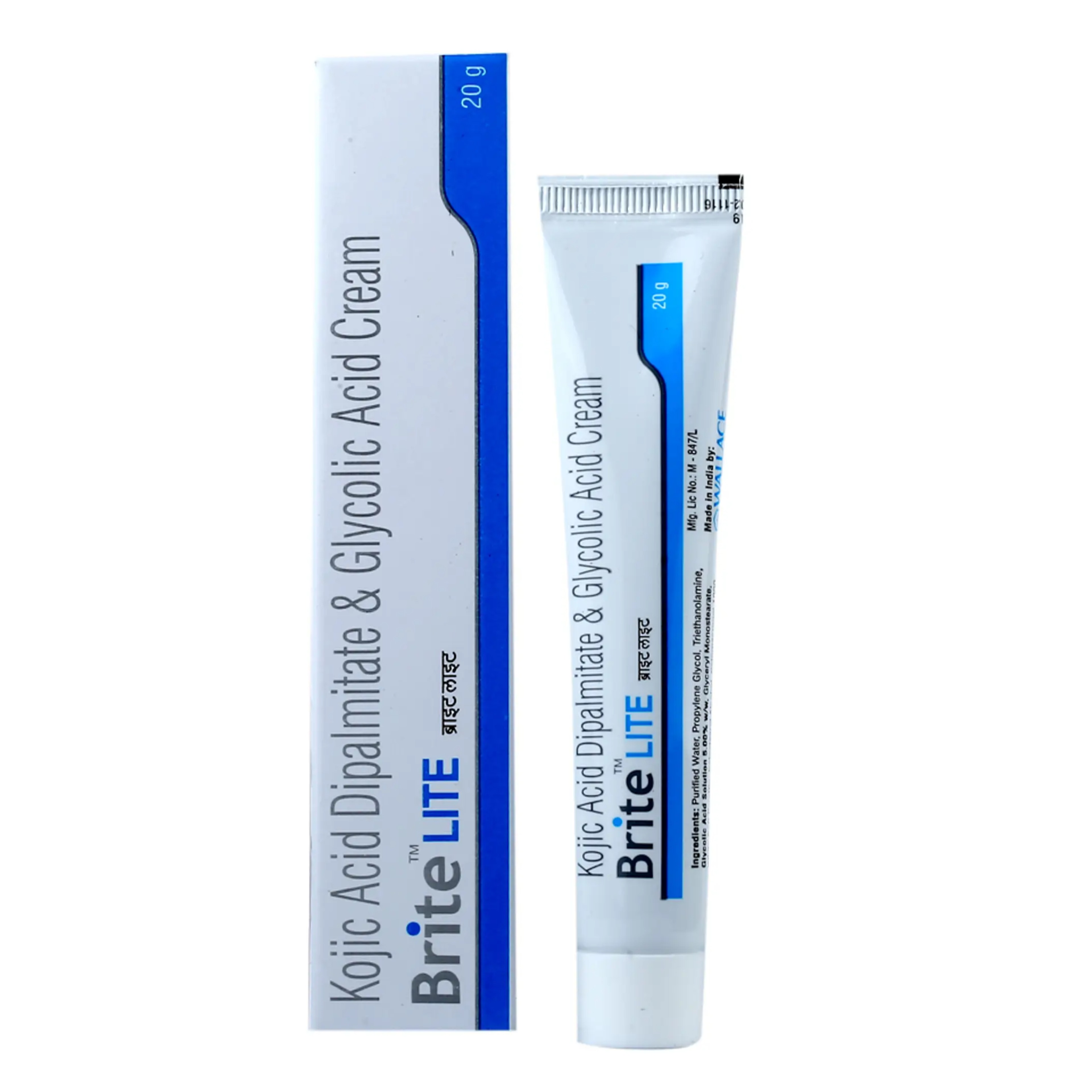 Brite Lite Cream is used for melasma, hyperpigmentation, premature ageing, and reducing scars and freckles. It is a skin-lightening cream that contains kojic acid dipalmitate and glycolic acid. It helps lighten the skin tone and reduces blemishes.