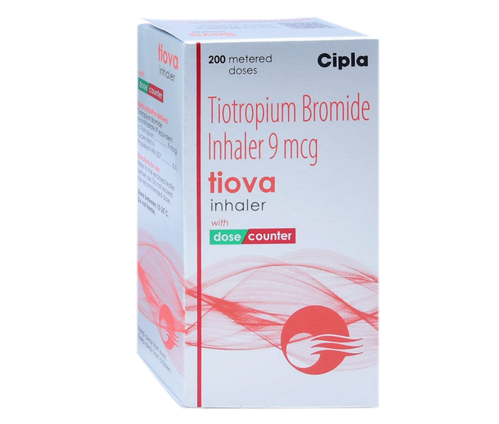 Brand / Product: Tiova Inhaler (9 mcg), Metered‑Dose Inhaler (MDI) Manufacturer: Cipla Ltd (India) Product Type: Prescription bronchodilator inhaler Active Ingredient : Tiotropium Bromide — 9 mcg delivered per actuation (dose) Formulation & Packaging : Form: Pressurized metered‑dose inhaler (MDI) Pack Size: 200 metered doses (200 MDI) in one canister Indications (Primary Uses) : Chronic Obstructive Pulmonary Disease (COPD) — maintenance treatment to ease breathing by relaxing airway muscles Asthma (Maintenance Therapy) — used for long‑term control, not for sudden/asthma attacks Mechanism of Action : Class: Long‑acting anticholinergic bronchodilator Blocks muscarinic receptors in airway smooth muscle → relaxes & widens airways to improve airflow Typical Dosage : Usual Use: Generally 1–2 puffs once daily Chronic Obstructive Pulmonary Disease (COPD) Purpose: Maintenance treatment to improve breathing. How it helps: Relaxes airway muscles, reduces bronchospasm, improves airflow, and decreases COPD symptoms like shortness of breath and wheezing. Asthma (Maintenance Therapy) Purpose: Helps control chronic asthma symptoms. How it helps: Opens airways over time to prevent bronchospasm and improve daily breathing comfort. General Bronchodilation Tiotropium (active ingredient) blocks muscarinic receptors in the lungs → relaxes airway smooth muscles → wider airways → easier airflow. Key Uses: COPD Management: Used for long-term maintenance treatment to improve airflow and reduce exacerbations in chronic bronchitis and emphysema. Asthma Control: Used as an add-on maintenance treatment for patients with asthma. Symptom Relief: Relaxes muscles in the airways, making breathing easier and reducing chest tightness. Tiova Inhaler 9 mcg (200 MD) is a long-acting bronchodilator containing Tiotropium Bromide, designed for the maintenance treatment of Chronic Obstructive Pulmonary Disease (COPD) and asthma. It works by relaxing airway muscles to reduce symptoms like shortness of breath, wheezing, and coughing. It is for daily maintenance, not for acute rescue.